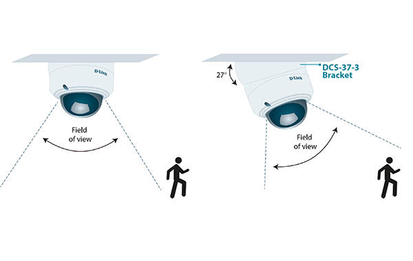 Ceiling mount angle bracket for DCS-4602EV, DCS-4603, DCS-4802E cameras. Allows you to adjust the camera vertical field-of-view by 27 degrees.