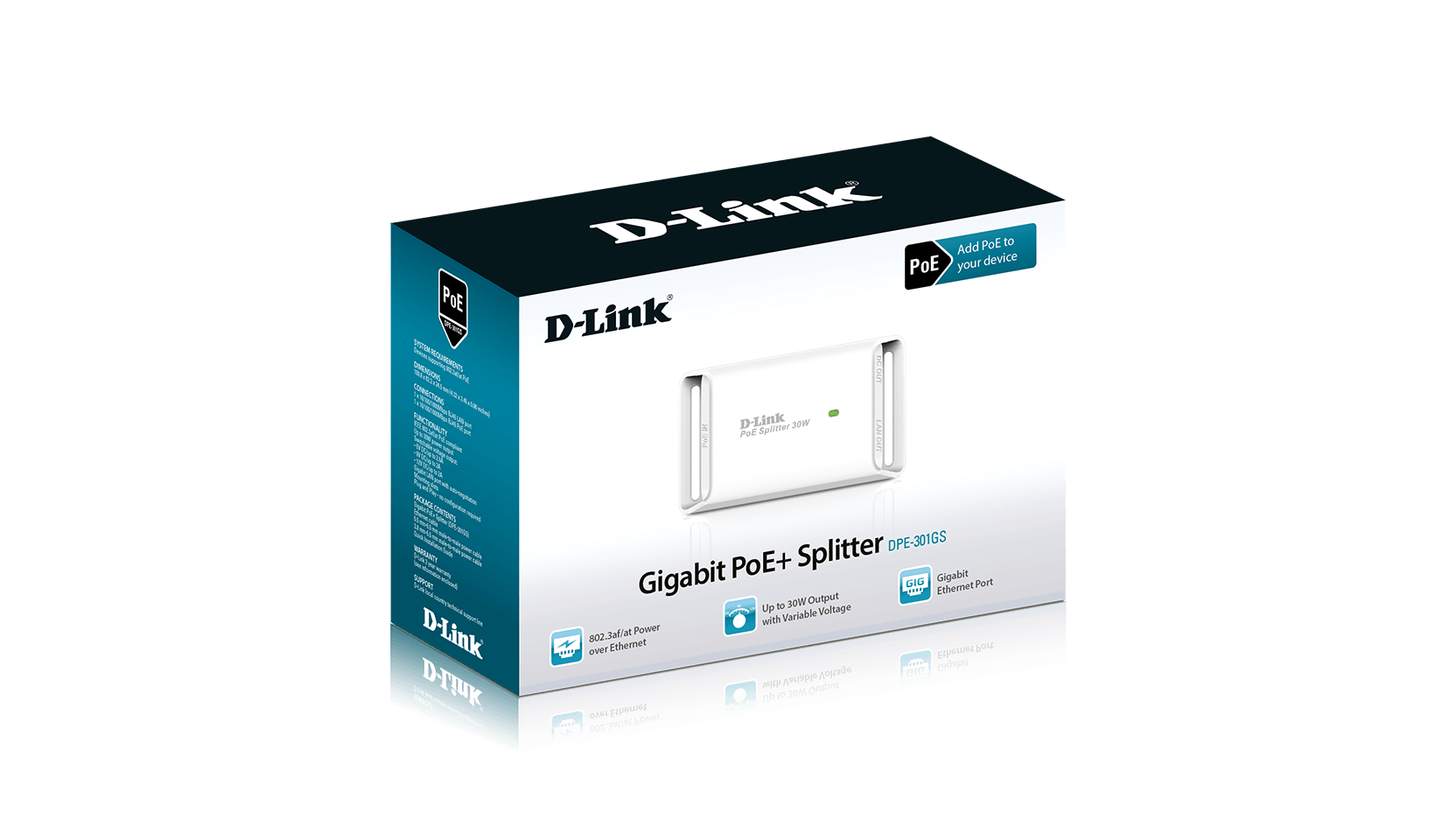 The DPE-301GS Gigabit PoE+ Splitter provides Gigabit connectivity and high wattage electrical power to legacy devices that do not support PoE, by separating power and data from a PoE source.